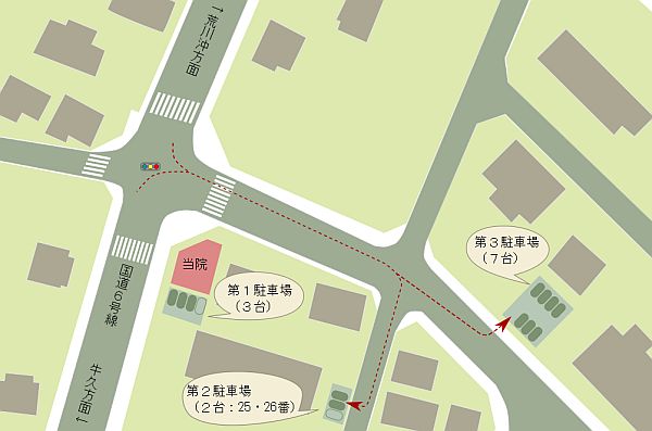 駐車スペースは、当院敷地内南側に3台分、当院裏手に2+7台分、合計3箇所に12台分ございます。